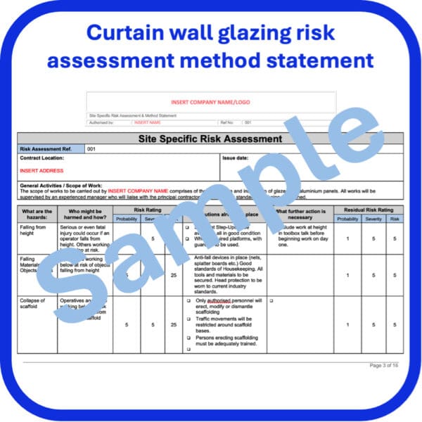 A comprehensive risk assessment and method statement template for curtain wall glazing, developed by qualified health and safety professionals.