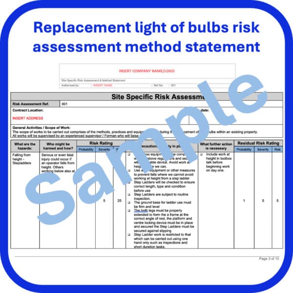 A comprehensive risk assessment and method statement template for replacement of light bulbs , developed by qualified health and safety professionals.