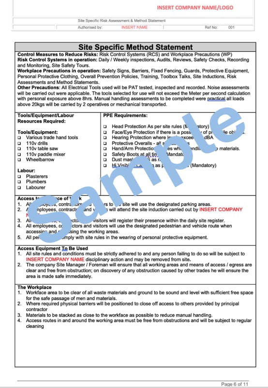 The document covers all the appropriate Control Procedures and Hazards for a typical job but can be easily edited to your needs. This is a ready-to-use document that can be implemented in your business straight away.